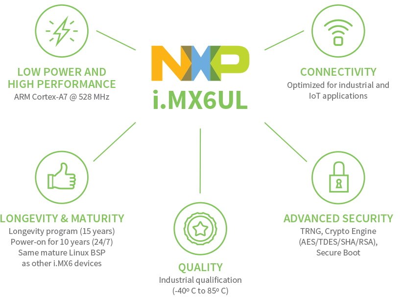 最小的外形尺寸。功耗最低。有线或无线。预认证。适用于所有连接设备的 i.MX6UL UltraLite SOM 平台解决方案。